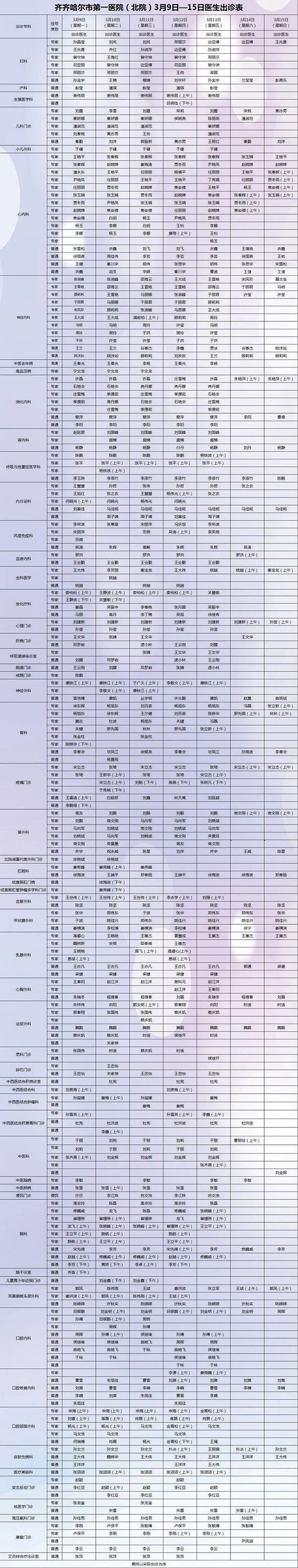 保障安全 护佑健康——齐齐哈尔市第一医院3月9日-3月15日出诊安排