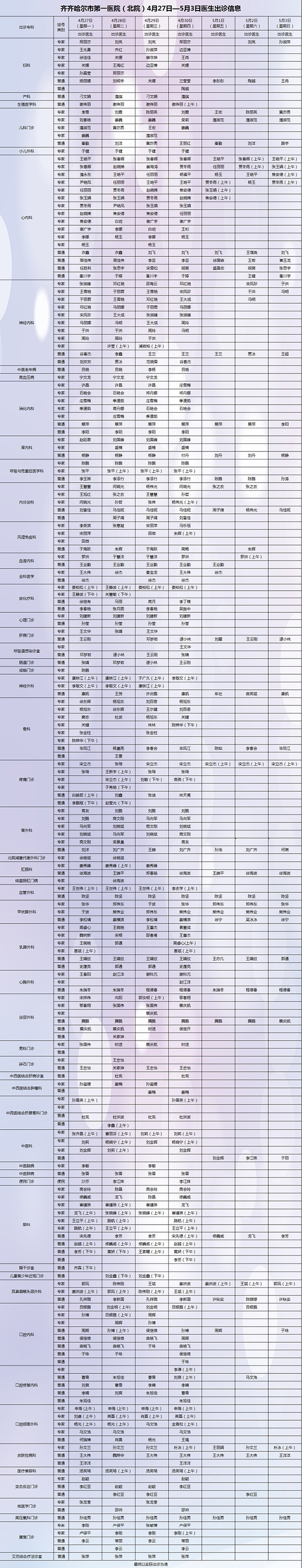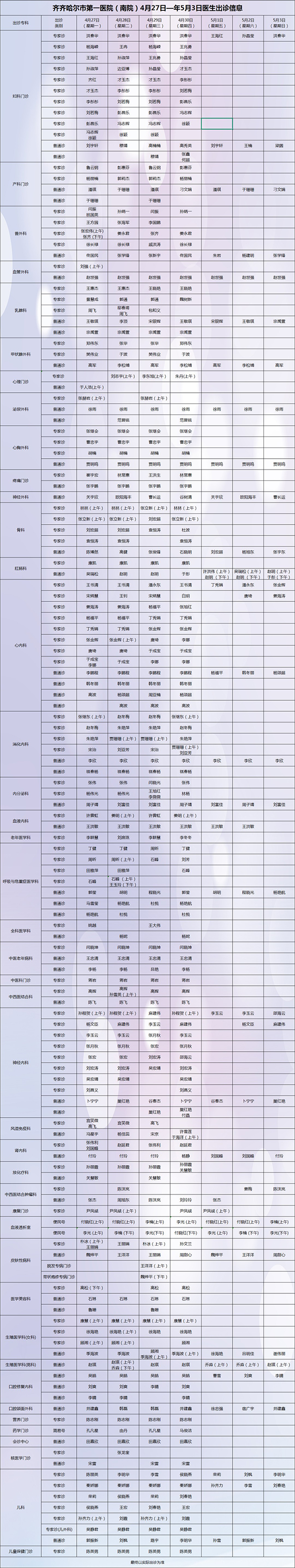 保障安全 护佑健康——齐齐哈尔市第一医院4月27日-5月3日出诊安排