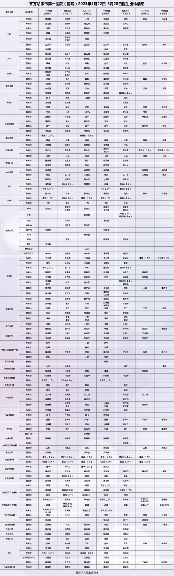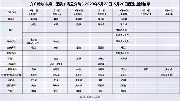 保障安全 护佑健康——齐齐哈尔市第一医院5月22日-5月28日出诊安排