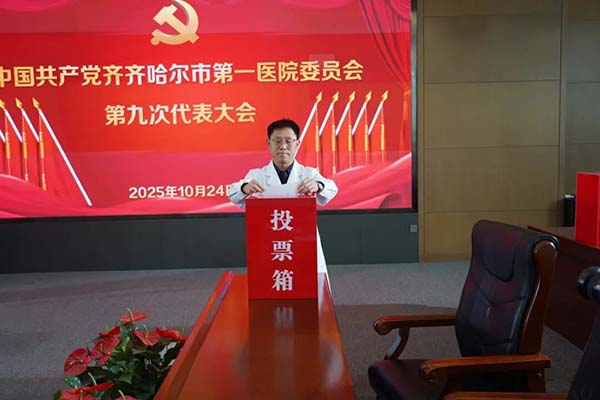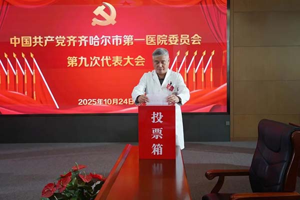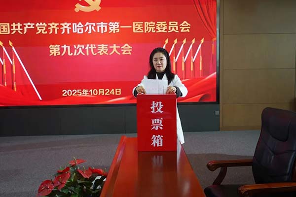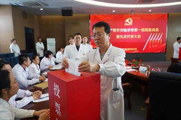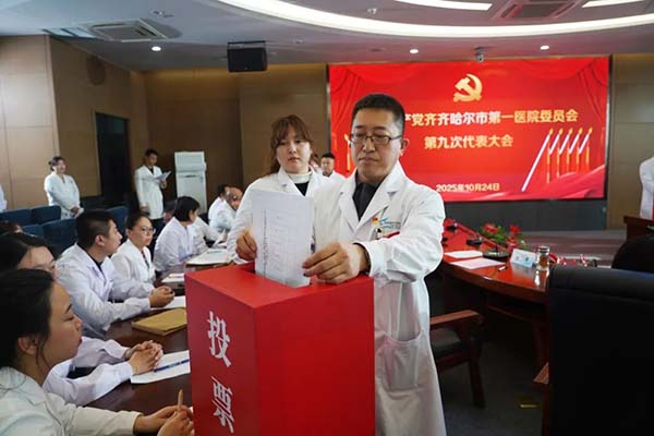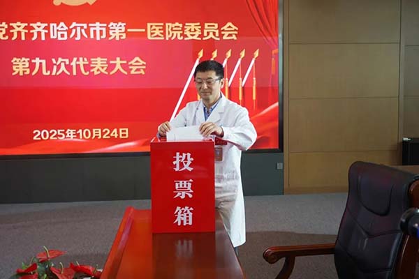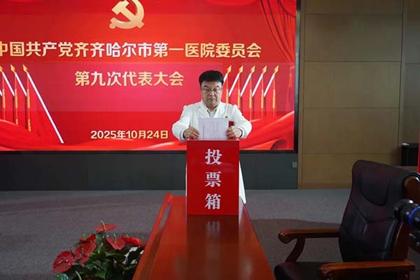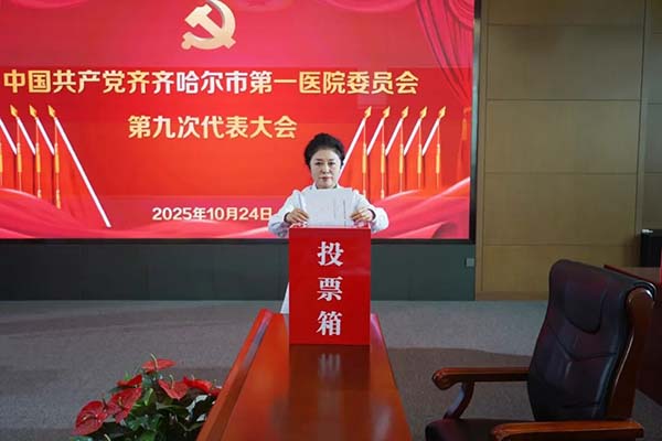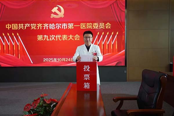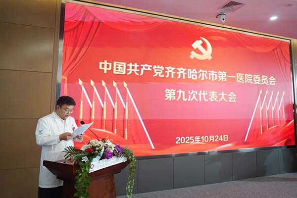 在党的二十届四中全会胜利召开之际,在深化医药卫生体制改革向纵深推进的关键节点,在齐齐哈尔市第一医院即将迎来建院115周年的重要时刻,10月24日,中共齐齐哈尔市第一医院委员会第九次代表大会在南院学术报告厅隆重召开。140名来自临床、医技、行政、后勤各条战线的党员代表齐聚一堂,以高度的政治责任感共商医院发展大计,圆满完成党委换届选举,为医院开启高质量发展新征程筑牢组织根基、凝聚奋进力量。