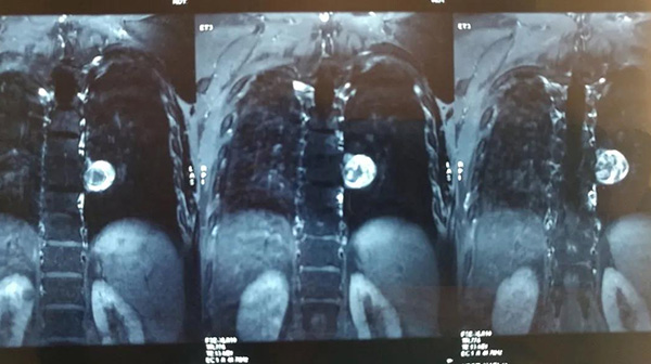 近期,家住齐齐哈尔市龙沙区的张先生因行走无力,来到附近医院就诊,其胸椎核磁共振提示,胸腔内长了一个巨大肿物且侵袭了胸椎管及胸腔,因手术难度大,技术要求高,术中稍有不慎将导致患者瘫痪、胸膜破裂或大血管损伤破裂,甚至死亡,多家医院便都拒绝了张先生的手术需求。因症状一直得不到缓解,辗转多家医院无果,张先生一度陷入了深深的痛苦之中。医生建议他去北京的大医院走走看看,如果前往北京治疗,除了面临高额的手术费用,还要考虑到疫情期间是否可以如期挂号、就诊,难度可想而知。一个偶然的机会,张先生得知齐齐哈尔市第一医院骨外二科主任罗先国在骨科疑难病例的诊治方面颇有建树,于是便在家人的陪同下找到罗先国。