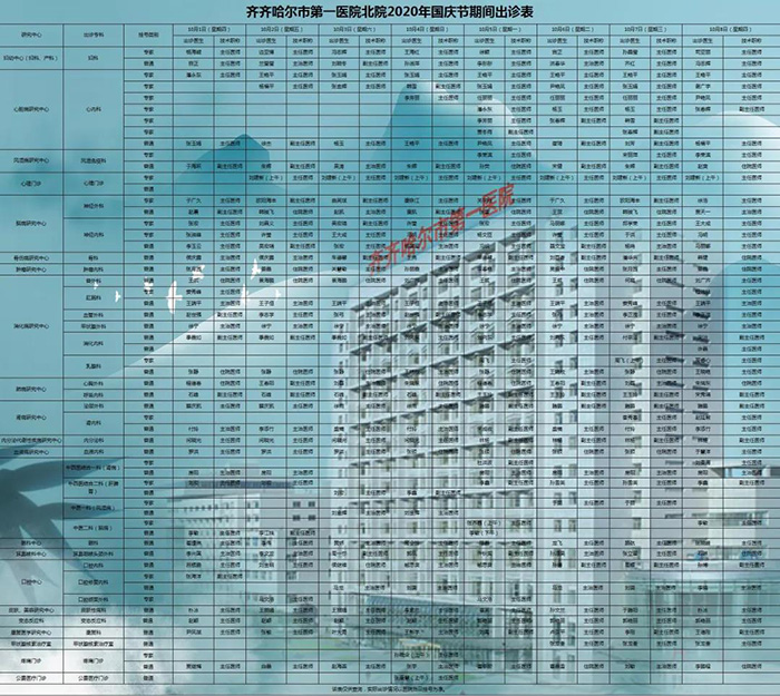 在中秋节、国庆节即将来临之际,为确保广大百姓充分享受到便捷、优质、高效的医疗服务,保障其就诊安全,齐齐哈尔市第一医院现作出如下出诊安排(含南北两院区),敬请知悉。