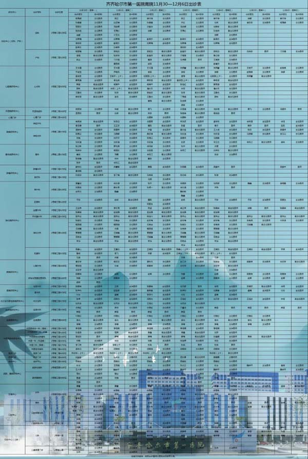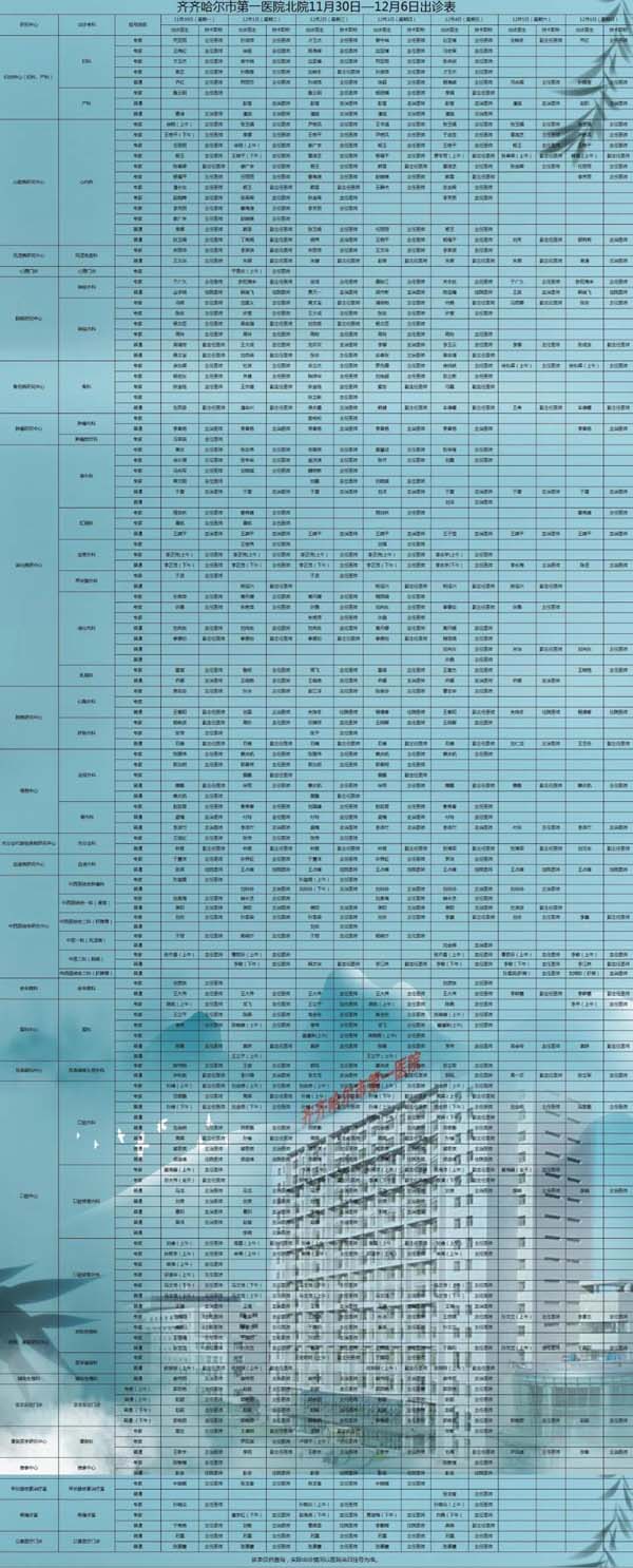 为向广大百姓提供便捷、优质、高效的医疗服务,保障其就诊安全,齐齐哈尔市第一医院现将下周(11月30日至12月6日)出诊安排(含南北两院区)调整如下,敬请知悉。