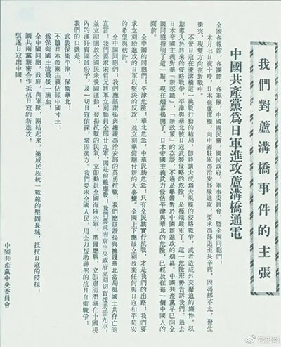 7月8日 中共中央发出《中国共产党为日军进攻卢沟桥通电》,指出:只有全民族实行抗战,才是中国的出路!号召全国同胞、政府和军队团结起来,筑成民族统一战线的坚固长城,抵抗日本的侵略。北平、天津、保定等地的人民群众和共产党领导的群众团体,纷纷起来支援第二十九军的抗战。全国人民也掀起抗日救亡、支援前线的热潮,给前方将士以巨大鼓舞。7月14日,中共中央军委命令红军做好开赴前线的准备。