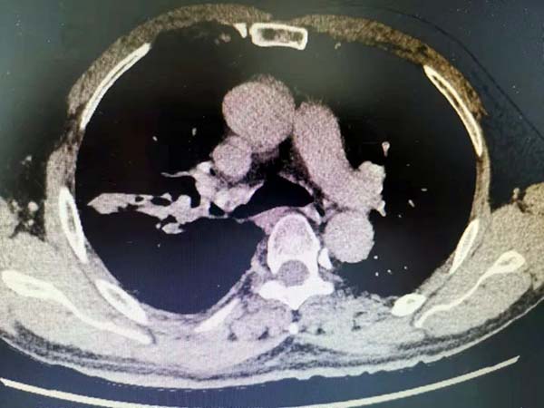 患者杨某,男,66岁,因“刺激性咳嗽”初步诊断为肺部肿瘤,为求进一步治疗来我院就诊。经CT、纤支镜及病理检查发现,病灶位于肺部右上叶支气管口处。肿瘤侵犯肺门严重、肿大淋巴结与血管紧紧挨着,同时患者出现营养不良的迹象,无法进行常规切除手术。科室主任曹忠宇为患者制定了“先新辅助、再进行右肺上叶袖式切除”的手术方案,在确保患者肿瘤彻底切除的前提下,最大限度地减少手术对患者的创伤,保留其肺部。前期先为患者进行化疗免疫双联新辅助技术(紫杉醇卡铂联合PD_1方案),经过两次新辅助治疗后,检查结果显示,肿瘤明显有缩小迹象。科室随即安排为患者进行全胸腔镜下右上肺叶袖式切除手术。